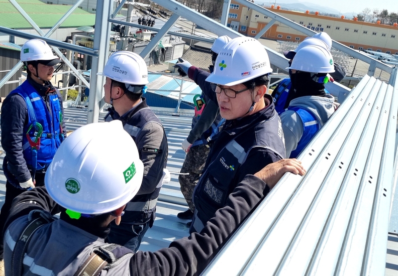 안전보건공단 충북북부지사 관계자들이 음성군의 한 건설현장에서 지붕공사 사고 예방을 위한 안전점검을 벌이고 있다.